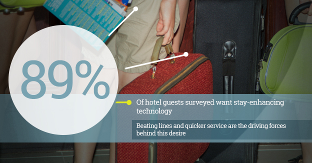 - L’89% degli ospiti vorrebbe trovare tecnologia in hotel per migliorare il proprio soggiorno (per ridurre le code e ottenere un servizio più rapido);
