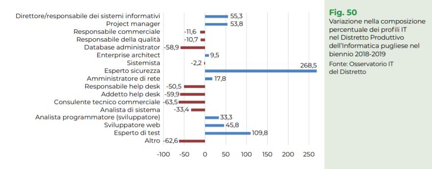 L'analista programmatore è la figura più richiesta dalle aziende. Ma se si guarda la variazione dei profili IT nel Distretto si vede una grande domanda nel biennio 2018-2019 dell'esperto di sicurezza informatica. Quella cybersecurity che spinge a proteggere i sistemi informatici dal rischio di attacchi.