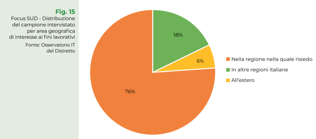 Come dicono i dati, circa il 76% degli intervistati dall'Osservatorio It del Distretto, vorrebbe trovare occupazione nella regione di residenza e solo il 17% è invece propenso a spostarsi in altre regioni. I restanti vorrebbero invece provare una esperienza all'estero.